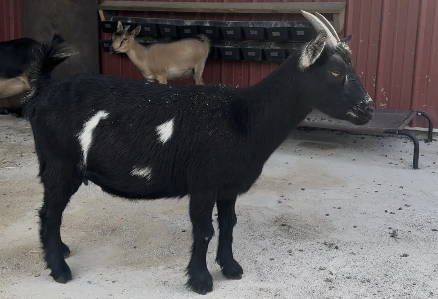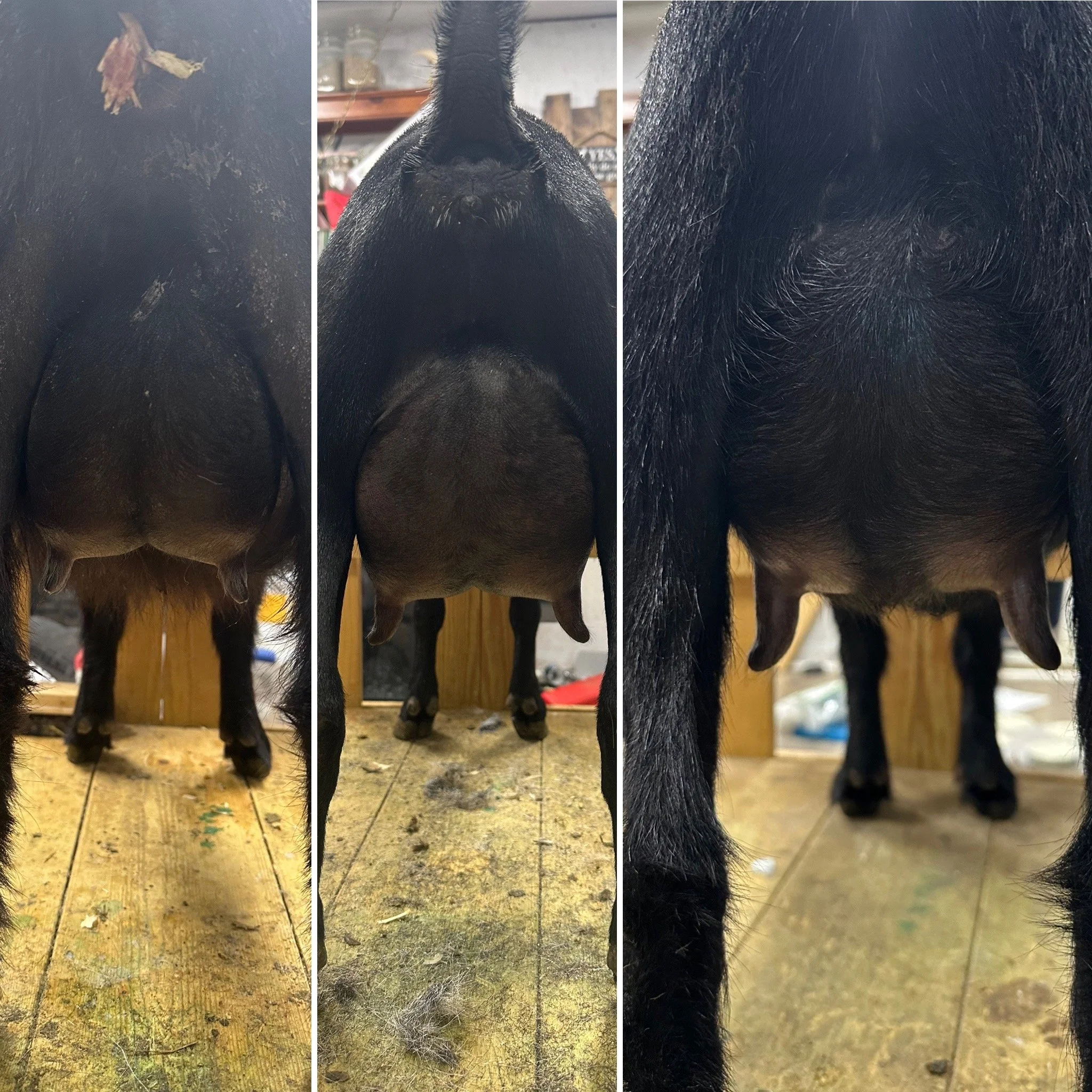 2025 LA Score GVGV 83 as a yearling first freshener. That’s a V (very good) in dairy strength and mammary, and G (good plus) in general appearance and body capacity. She received a V for her rear legs; a G for head, feet, back, and rump; and A (acceptable) for her front legs and shoulder assembly. Wednesday caught the eye of our appraiser who had high hopes for her future. We do too! I’m eager to have her appraised again in a year or two to see if she scores even better. Wednesday has an udder that is easy to hand milk, a sleek shiny black coat, and attitude for days. She was the first goat to be registered under our herd name, and has already made me very proud. I look forward to seeing her achieve her full potential in years to come.