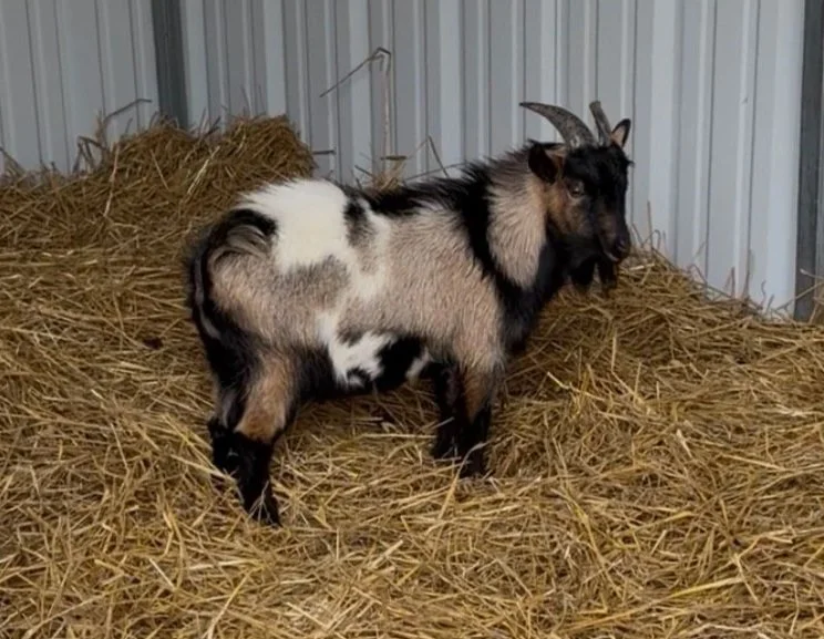 Chamoise with white and moonspots, horned, and friendly. Romeo is mild mannered and gentle. His dam has one of my favorite udders in our herd.