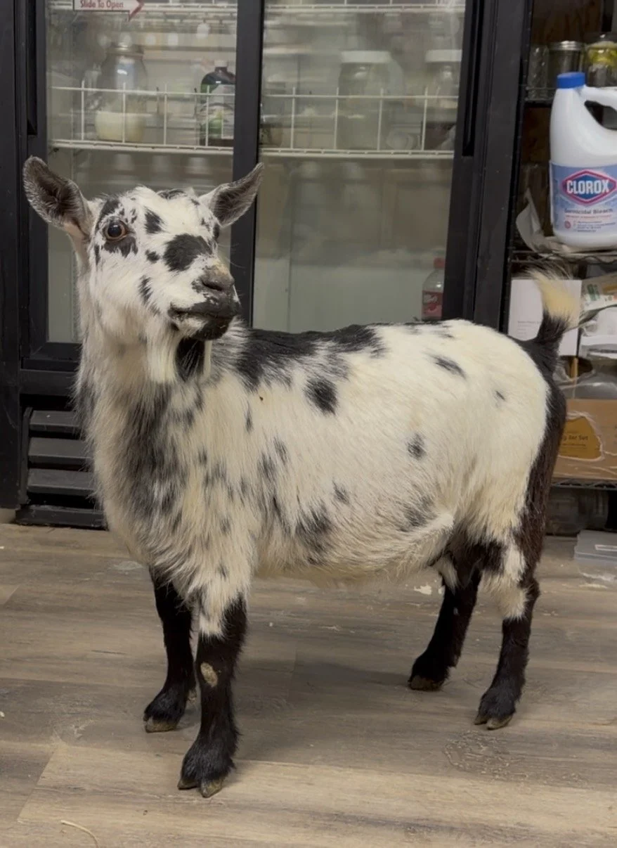 Voodoo is a striking black and white doe with blue eyes. She is polled and has been such a joy. She freshened for the first time 2/7/26 and has a nicely attached udder that’s easy to hand milk. She gave us a single doeling that was the largest kid of the season!